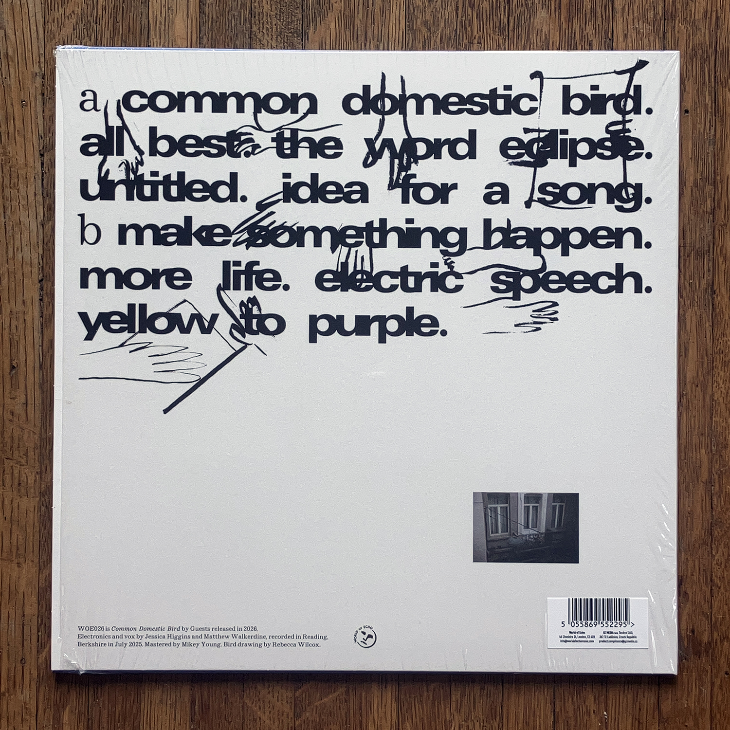 Whatever dissatisfaction haunted the 1st Guests LP, it’s been shed in advance of their 2nd. This is a band that’s gone past breaking something and is fully in the “make it do something else” phase. Patient, doleful melodies—picture a cartoon tuba, bulging eyes and wheezing lungs, tumbling down a staircase. Studio fuckery, the kind of echo abstraction that might be called dub but in the same way that the Raincoats thought they were a reggae band? Deeply unintuitive drum programming. And then these riveting monologues delivered in a careful, trenchant voice. Look we all love Moss Icon but spoken vocals can wear out quick: see “And Dream of Sheep” or “F.E.E.L.I.N.G.C.A.L.L.E.D.L.O.V.E.” But Jessica Higgins, remember, is an attentive listener, someone with a keen demand for so much more. The organization of words and sounds is compelling, the stories and their crooked wisdoms better through repetition. The more I play this record the more I understand its scale of accumulation. The layering of sound and voice mirrored in the layering of stress and discovery, layered again in the careful unfolding of an approach to the world, of placing oneself in the world.