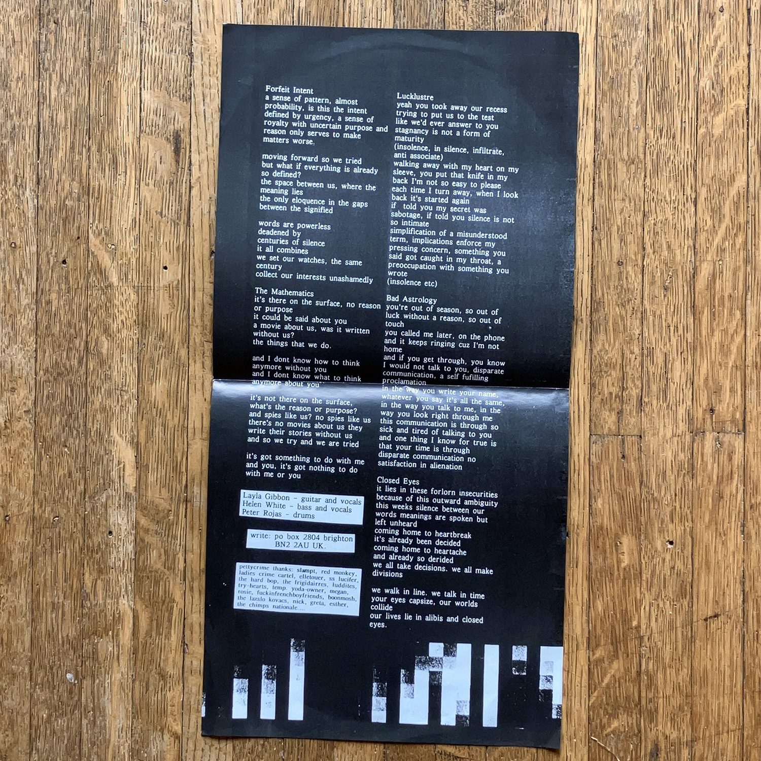 Original, unplayed copies of this masterpiece of lightning-strike punk. Released by Slampt in 1998, this five-song EP is prickly, breathless, and petulant. With some of my favorite lyrics of all time (“insolence/in silence” COME ON!!!! just perfect) and a braced, unblinking fearlessness, this is the music in my head/ears when I am the best version of myself. The bravest, the most daring, the clearest belief that we are going to beat those fuckers.